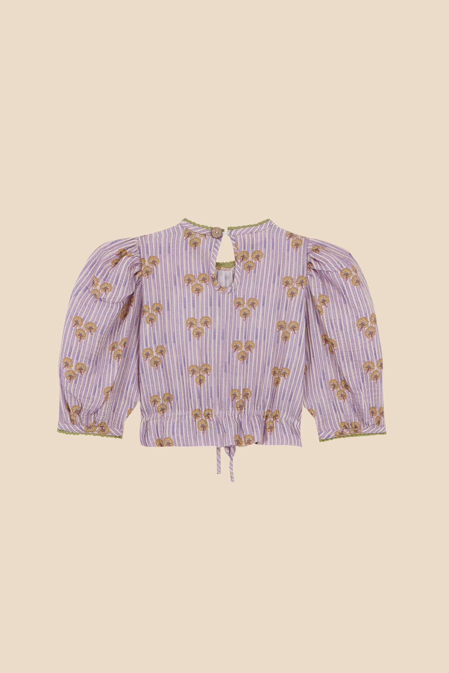 Printed short-sleeved blouse with ruffle and back button fastening.