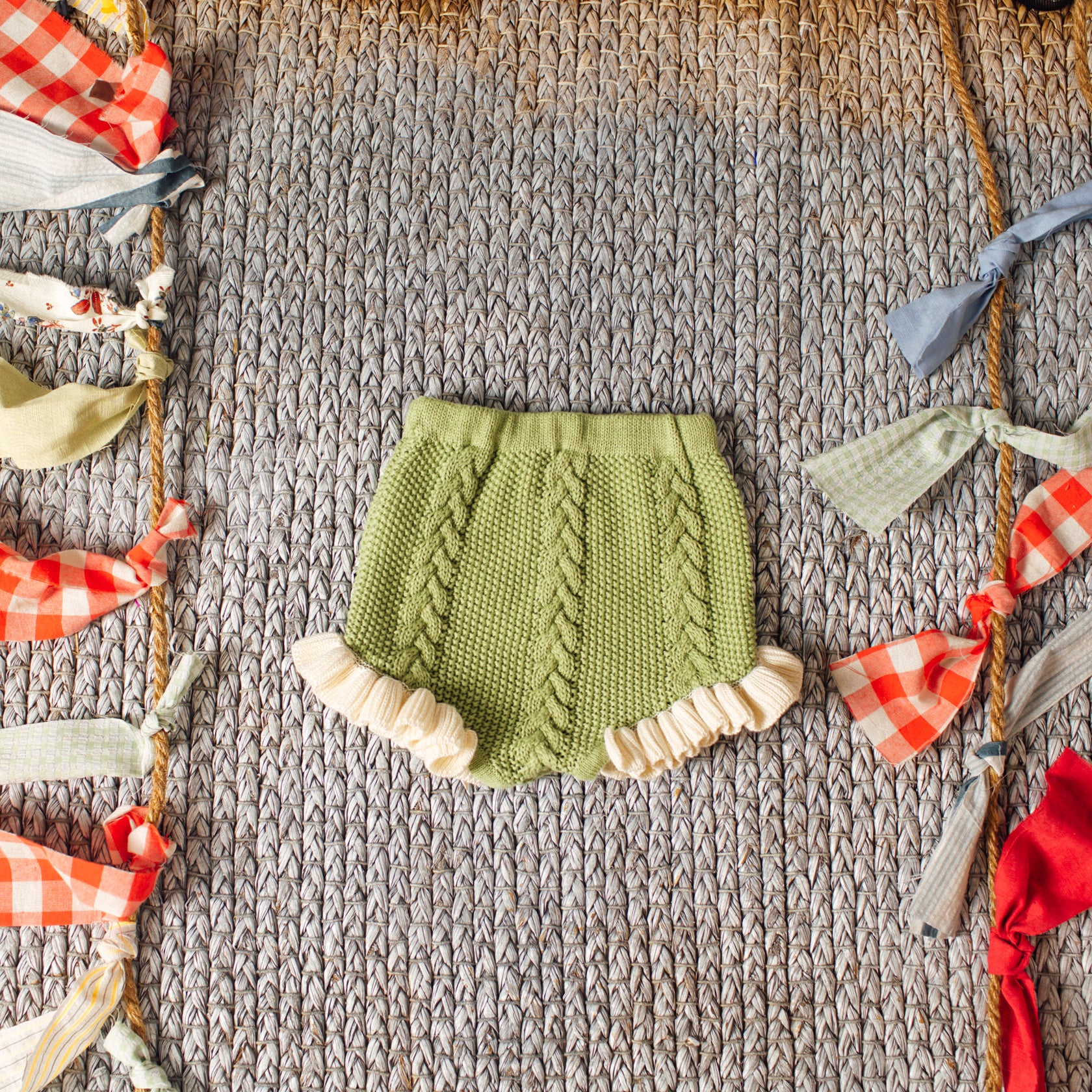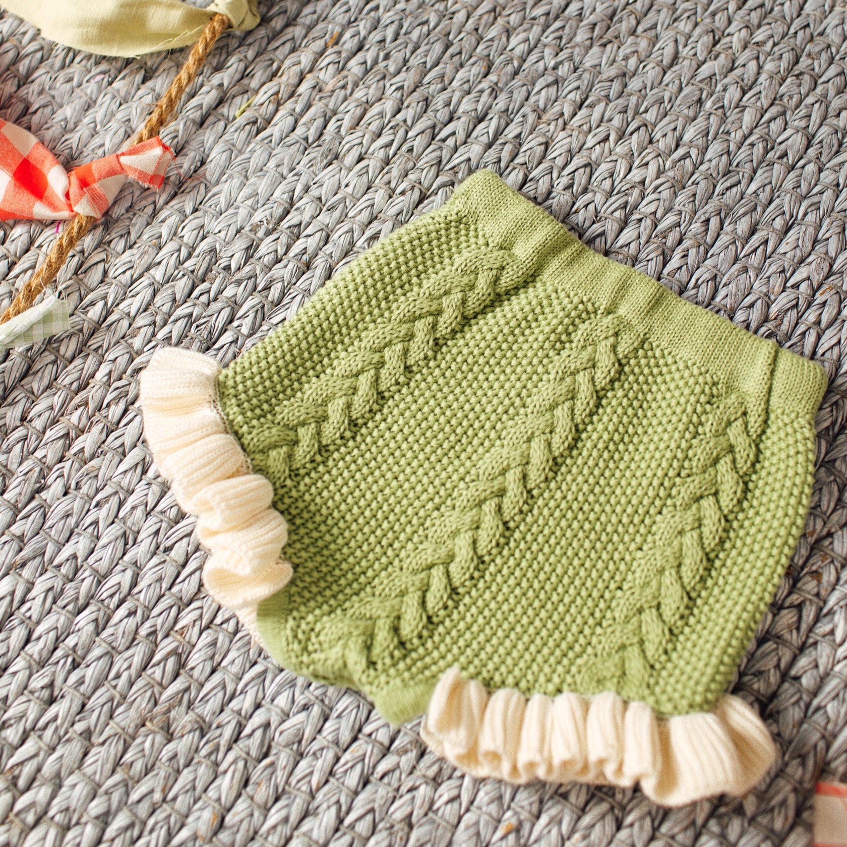 Knitted bloomer short with ruffle trim.