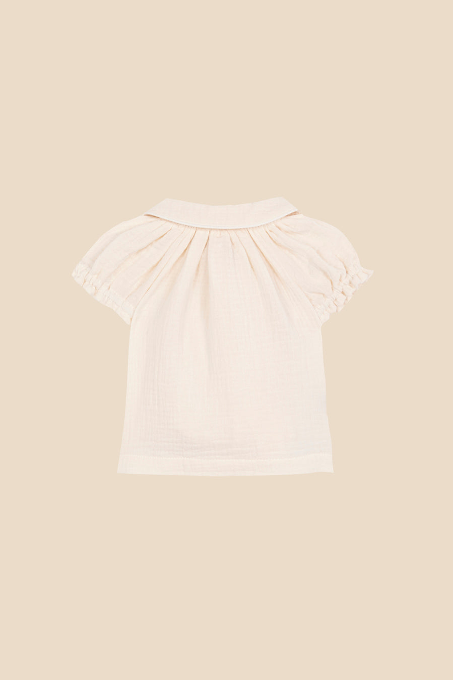 Blusa de manga corta acabada en goma con cuello bobo y detalle bordado. Cierre con botonadura frontal